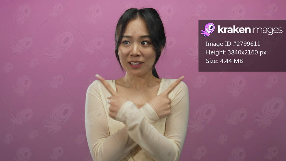 Woman expressing excitement with crossed arms and pointing fingers against isolated pink background, showcasing joyful gesture and dynamic pose.