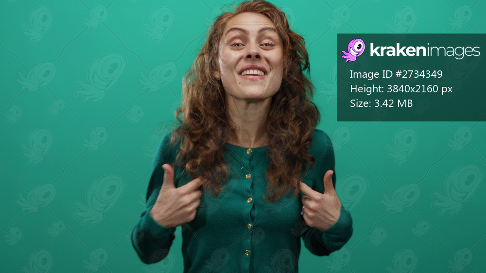Woman expressing excitement with lively gestures against a vibrant green background, highlighting her curly hair and animated facial expressions in an energetic portrait. - Kraken Images