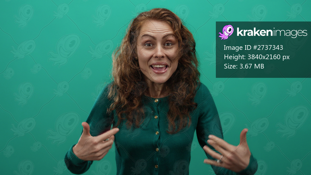 Woman expressing excitement with lively gestures against a vibrant green background, highlighting her curly hair and animated facial expressions in an energetic portrait. - Kraken Images