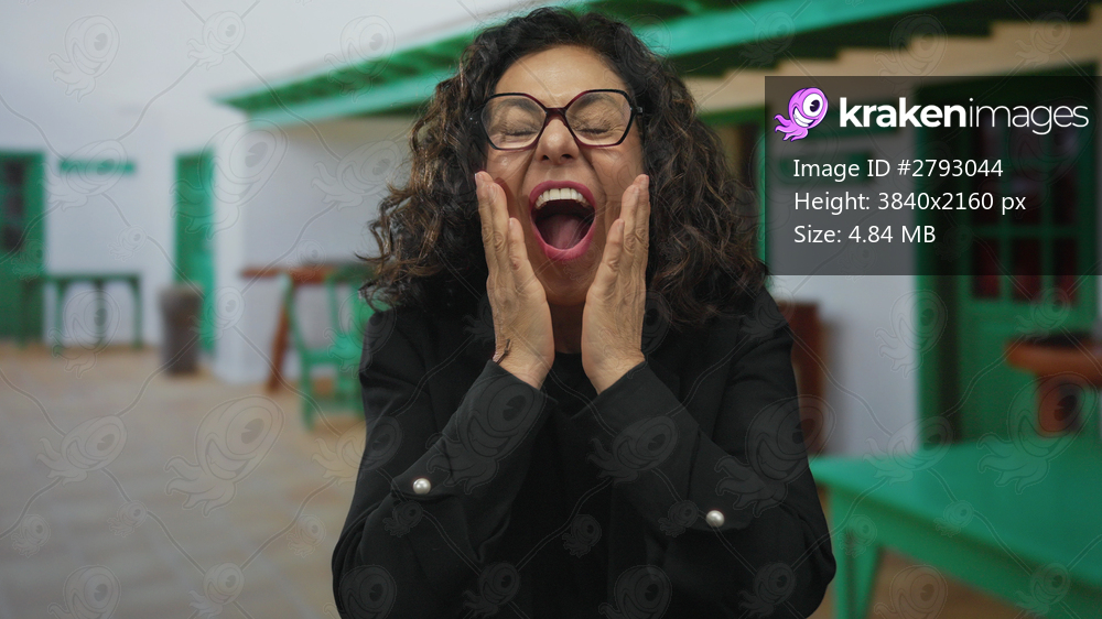 Woman expressing excitement outdoors with green background, representing emotion and surprise, wearing formal attire in a vibrant setting.
