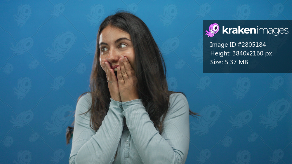 Woman expressing excitement and surprise over isolated blue background wall with hands on cheeks capturing emotion and mood in a vivid context.