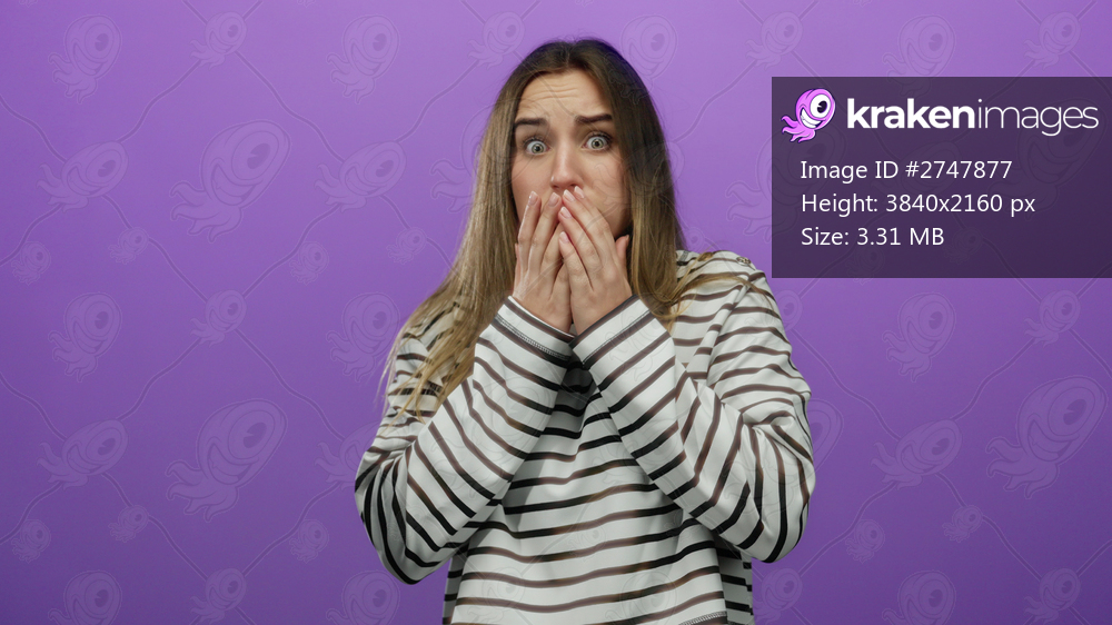 Woman expressing fear against isolated purple background wearing striped shirt with blonde hair and hands raised close to her face.