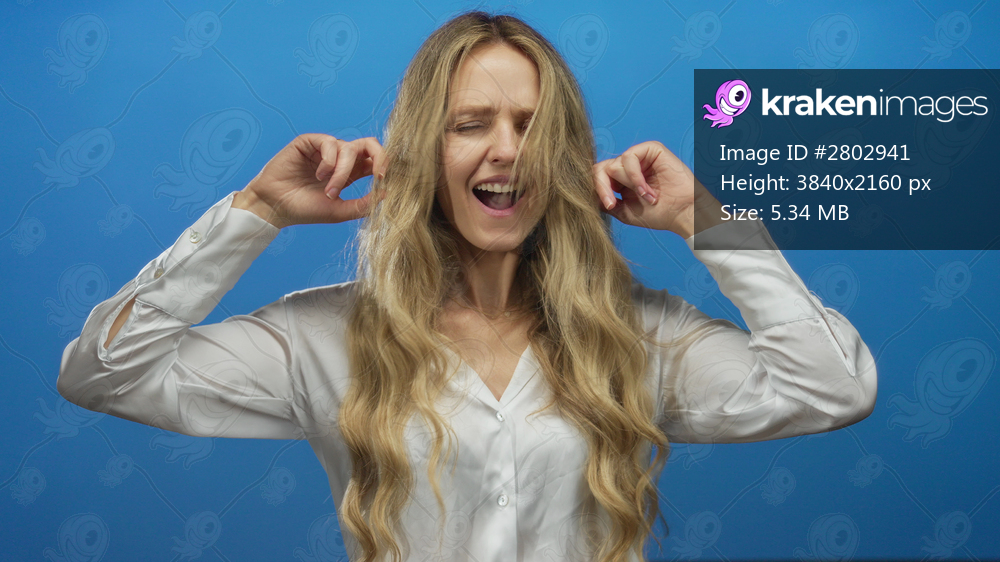 Woman expressing frustration with her fingers in her ears against an isolated blue background, wearing a white shirt and showcasing blonde hair in a puzzling situation. - Kraken Images