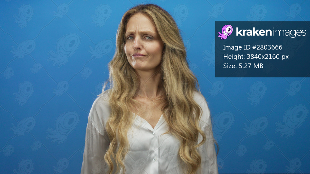 Woman expressing frustration with her fingers in her ears against an isolated blue background, wearing a white shirt and showcasing blonde hair in a puzzling situation. - Kraken Images
