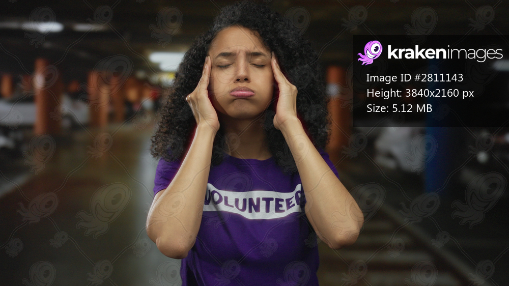 Woman expressing frustration in a dimly lit parking garage, wearing a purple volunteer shirt, surrounded by blurred cars, capturing a moment of stress in an urban setting. - Kraken Images
