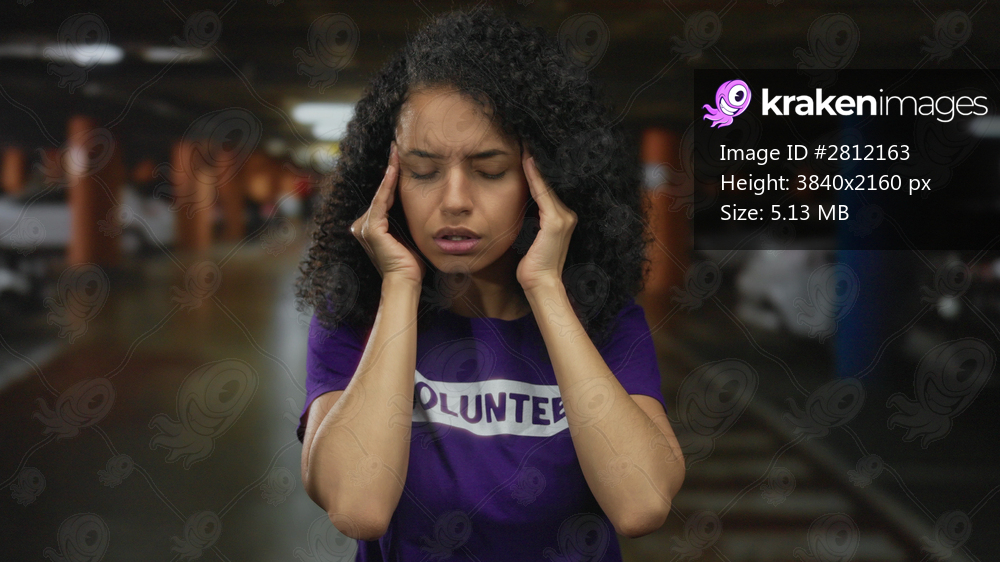 Woman expressing frustration in a dimly lit parking garage, wearing a purple volunteer shirt, surrounded by blurred cars, capturing a moment of stress in an urban setting. - Kraken Images