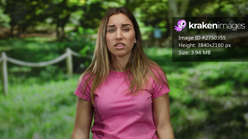 Woman expressing frustration in a peaceful park setting, wearing a pink shirt and showing emotion with her hands as she stands among the lush green outdoors. - Kraken Images