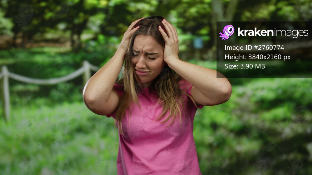 Woman expressing frustration in a peaceful park setting, wearing a pink shirt and showing emotion with her hands as she stands among the lush green outdoors. - Kraken Images