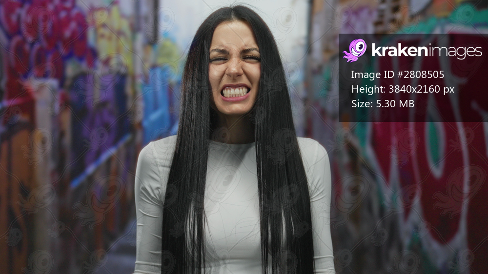 Woman expressing frustration in urban graffiti street wearing white shirt with vibrant colors around