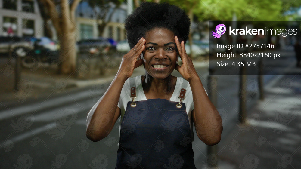 Woman expressing frustration on a city street wearing an apron with trees and cars in the background showcasing emotion in an outdoor urban setting.