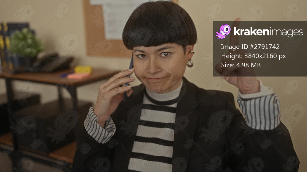 Woman expressing frustration on phone in office with striped shirt black blazer making gesture indoors with asian features background office supplies.