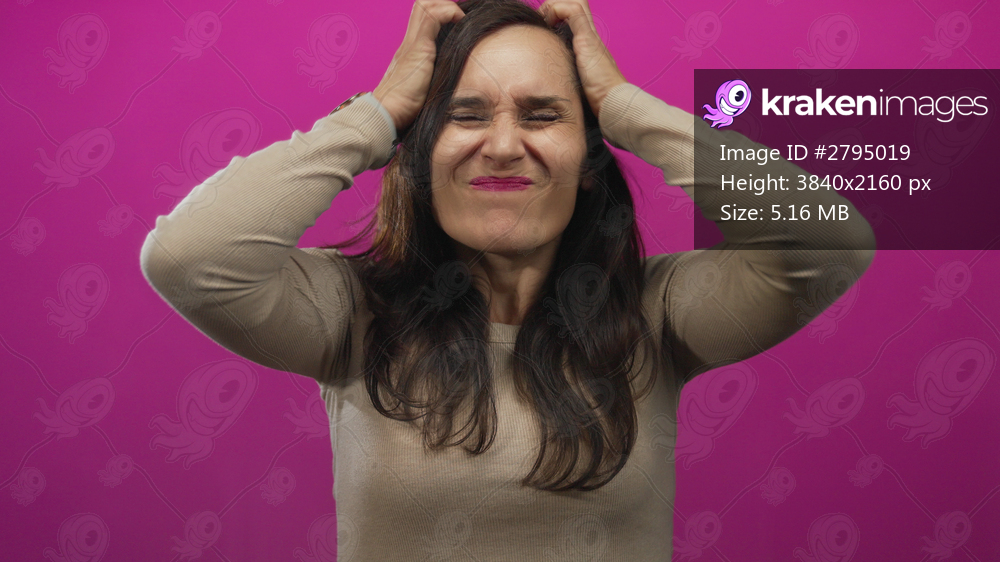 Woman expressing frustration over isolated pink background with hands on head, showcasing emotion and tension.