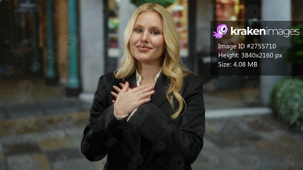 Woman expressing gratitude with hands on heart, standing outdoors in an urban street setting, wearing a black suit, blonde hair framing a serene smile, city background. - Kraken Images