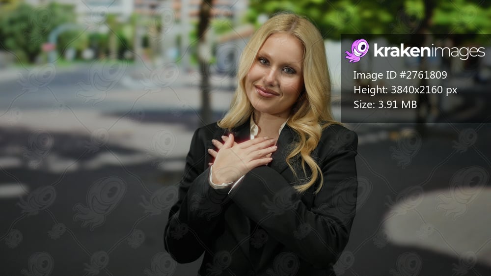 Woman expressing gratitude outdoors in city setting with trees and buildings, blonde hair, hands on chest, wearing black suit, sunny day, peaceful atmosphere, smiling, serene mood. - Kraken Images