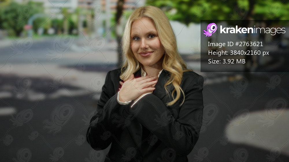 Woman expressing gratitude outdoors in city setting with trees and buildings, blonde hair, hands on chest, wearing black suit, sunny day, peaceful atmosphere, smiling, serene mood. - Kraken Images