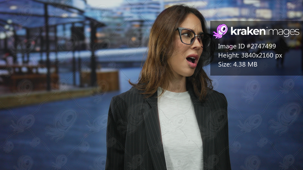 Woman expressing in city street wearing glasses and blazer during dusky urban outdoor scene, showcasing cityscape in background.