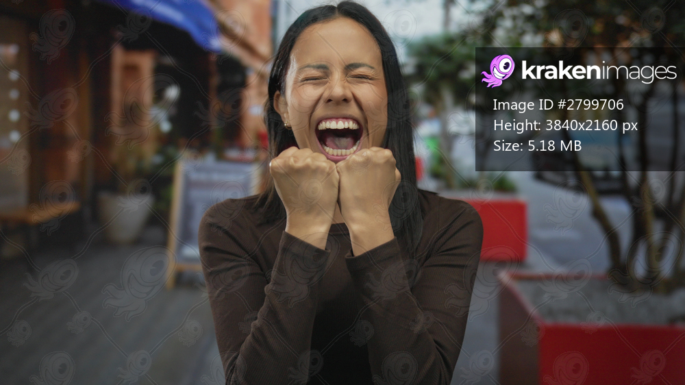 Woman expressing joyful excitement on a lively urban street with vibrant surroundings and cheerful atmosphere, enhancing the feeling of happiness outdoors. - Kraken Images