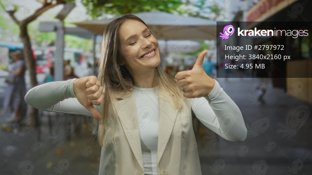 Woman expressing mixed emotions with thumbs up and down on a city street terrace, surrounded by outdoor coffee shop ambiance.