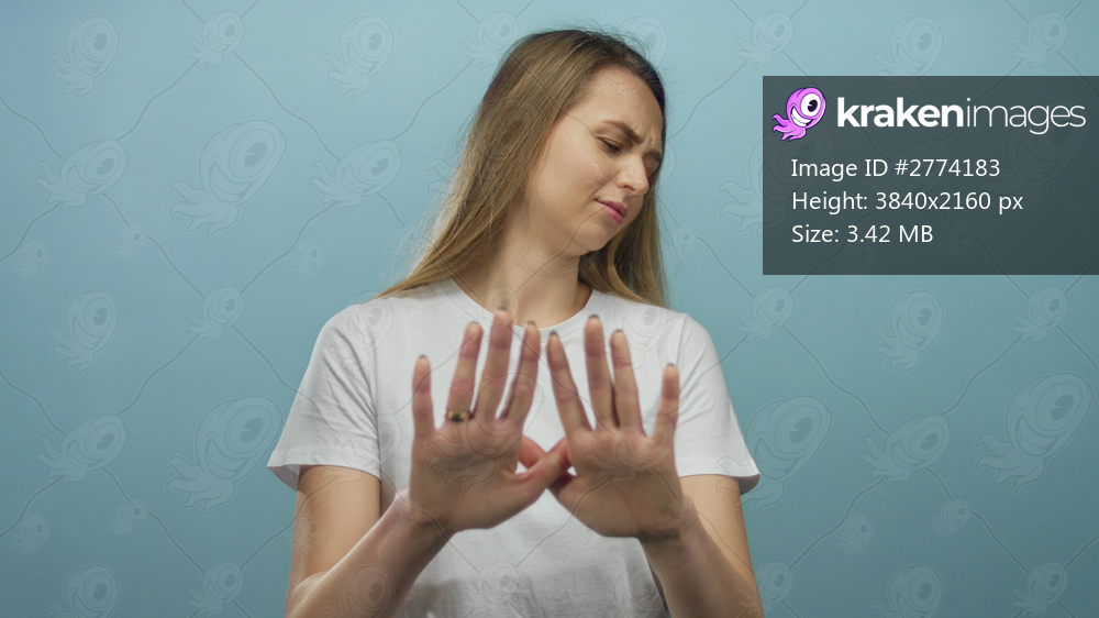 Woman expressing refusal with hands up against isolated blue background, capturing a moment of disapproval and emotion.
