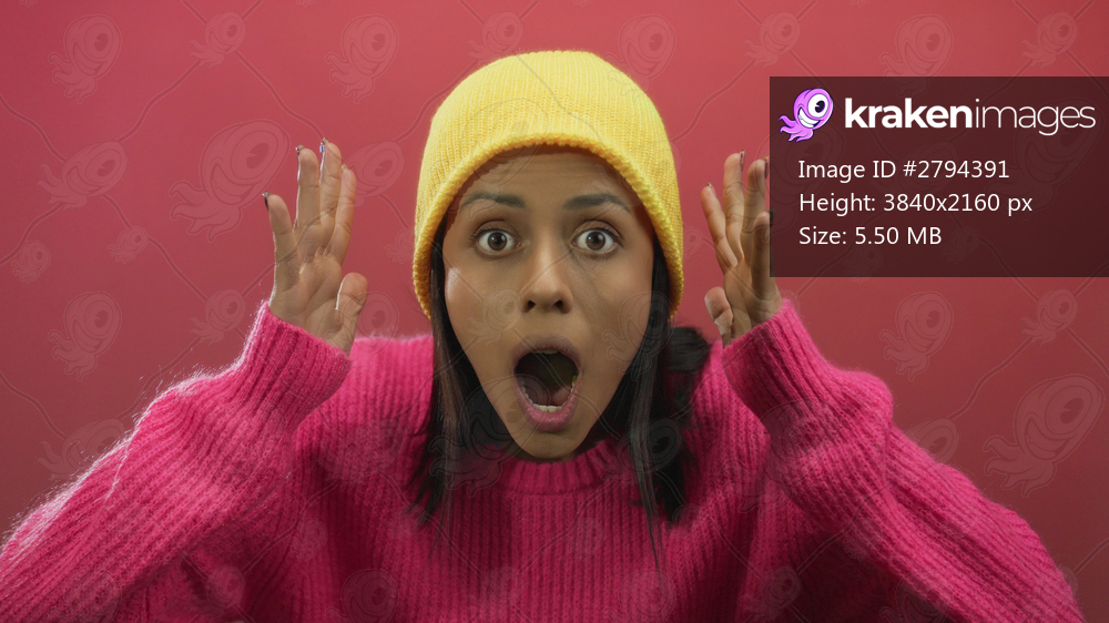 Woman expressing shock on a vibrant red background, wearing a bright pink sweater and yellow beanie, showcasing emotion and style in a bold visual setting. - Kraken Images