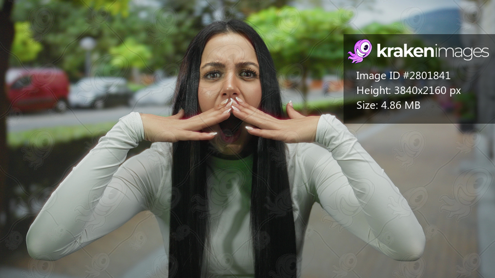Woman expressing shock and surprise on a city street with motion blur capturing her emotional reaction outdoors during daytime.