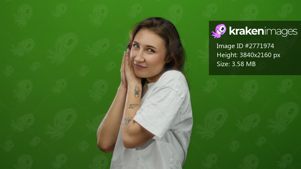 Woman expressing sleepiness with hands resting on cheek against a plain green wall, tattoos visible, wearing a casual white shirt.
