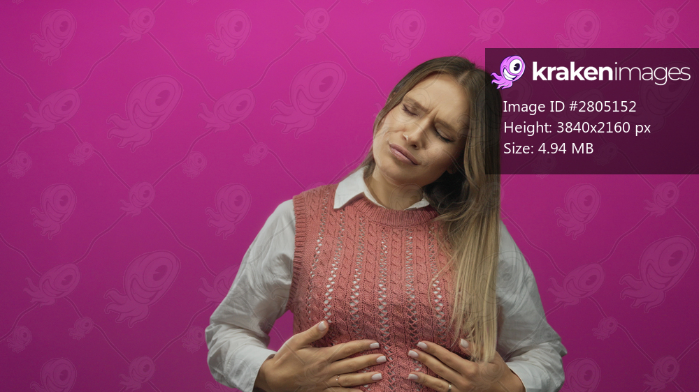 Woman expressing stomach discomfort over isolated pink background, showcasing blonde hair and pained expression in playful setting.