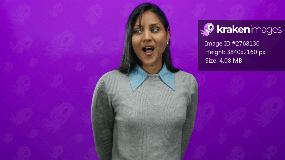 Woman expressing surprise against bright purple background showcasing emotions and mood with isolated setting accentuating young vibrant latin features - Kraken Images