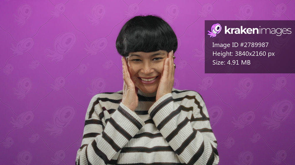 Woman expressing surprise and covering mouth with hands on a vibrant pink background, wearing a striped sweater with short black hair and hoop earrings. - Kraken Images