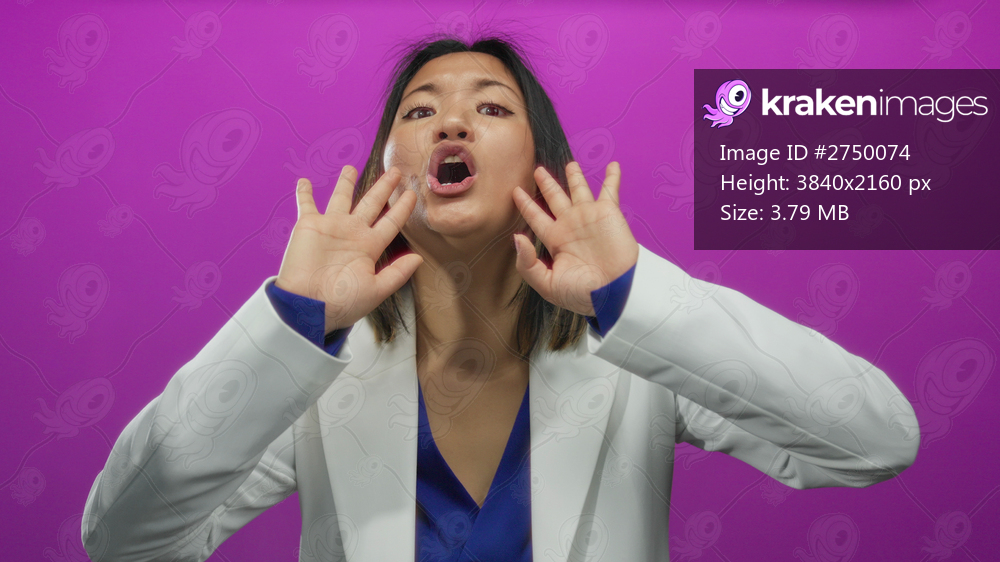 Woman expressing surprise and curiosity in a white blazer over a vivid pink backdrop, creating a vibrant and dynamic visual scene.