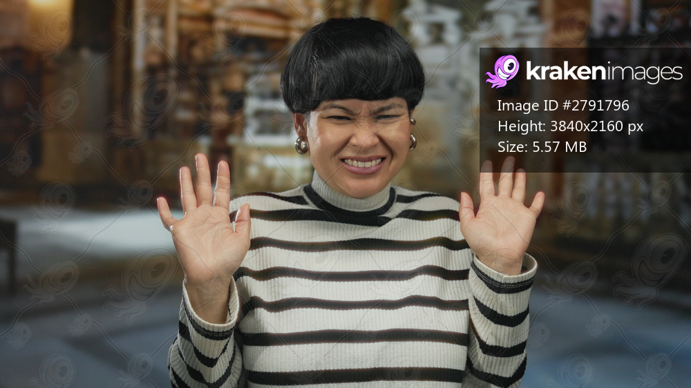 Woman expressing surprise and discomfort inside a church, wearing a striped sweater, highlighting a young chinese female in an indoor religious setting with elaborate architecture. - Kraken Images