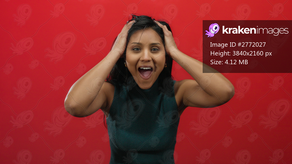 Woman expressing surprise and excitement with hands on head over a vibrant red background wall