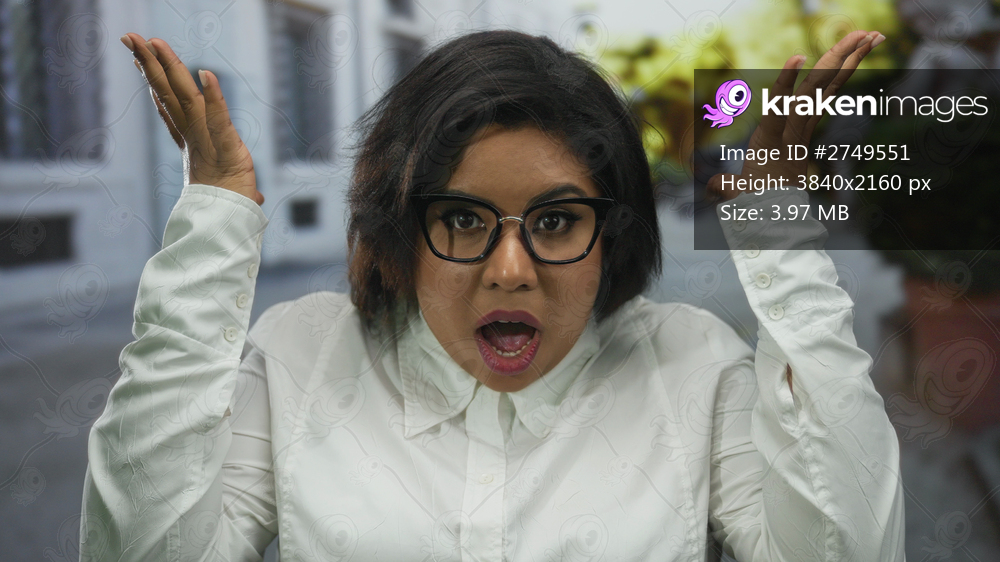 Woman expressing surprise with hands raised in an outdoor urban city setting during the day displaying astonishment on the street.
