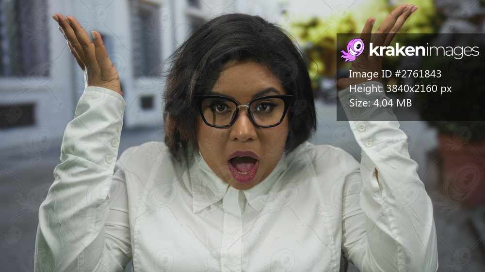 Woman expressing surprise with hands raised in an outdoor urban city setting during the day displaying astonishment on the street.