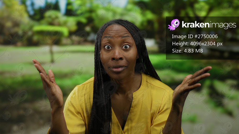 Woman expressing surprise in a sunny park, wearing a bright yellow shirt, with lush green trees in the background, embodying joy and vibrancy in an outdoor setting. - Kraken Images