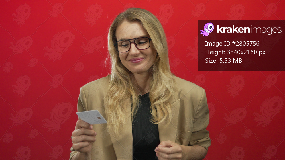 Woman expressing surprise in front of a red background, holding a credit card and showcasing shopping excitement in a professional setting
