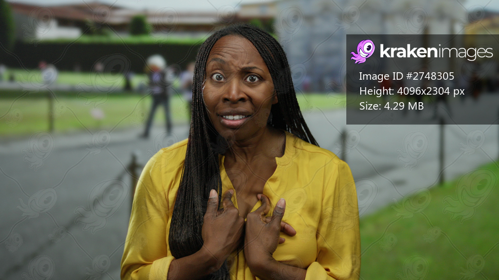 Woman expressing surprise near pisa tower, italy, wearing yellow shirt, outdoors with tourists in background, showcasing cultural travel experience in vibrant setting. - Kraken Images