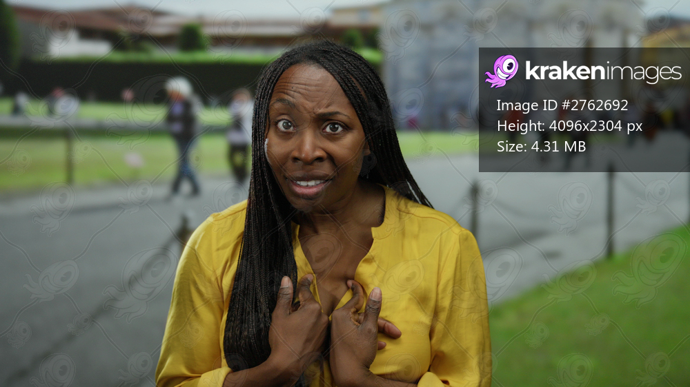 Woman expressing surprise near pisa tower, italy, wearing yellow shirt, outdoors with tourists in background, showcasing cultural travel experience in vibrant setting. - Kraken Images