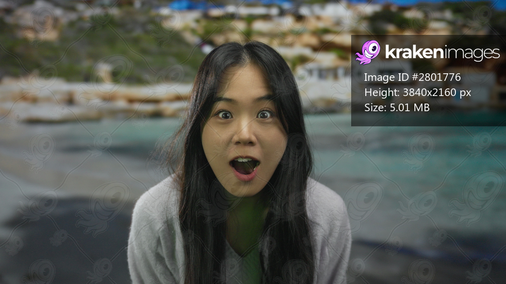 Woman expressing surprise on a beach with ocean and cliffs in the background, capturing a joyful outdoor moment.