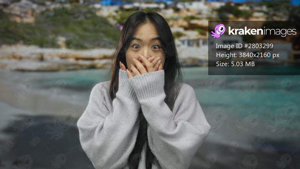 Woman expressing surprise on a beach with ocean and cliffs in the background, capturing a joyful outdoor moment.