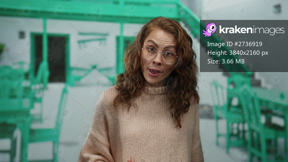 Woman expressing surprise on restaurant terrace with green chairs and city backdrop wearing glasses and a sweater outdoors during the day.