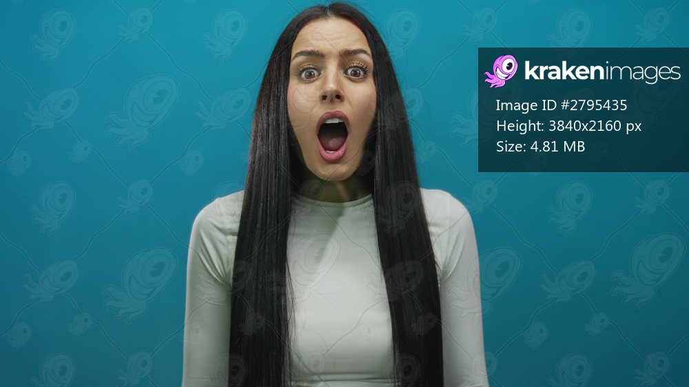 Woman expressing surprise with open mouth and hands near face against an isolated, vibrant blue background.
