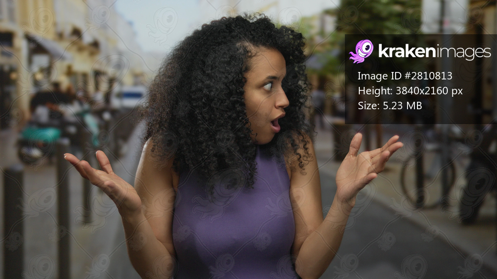Woman expressing surprise outdoors on busy street, showcasing vibrant urban scene with energetic emotion amidst lively city backdrop blending into a colorful environment. - Kraken Images