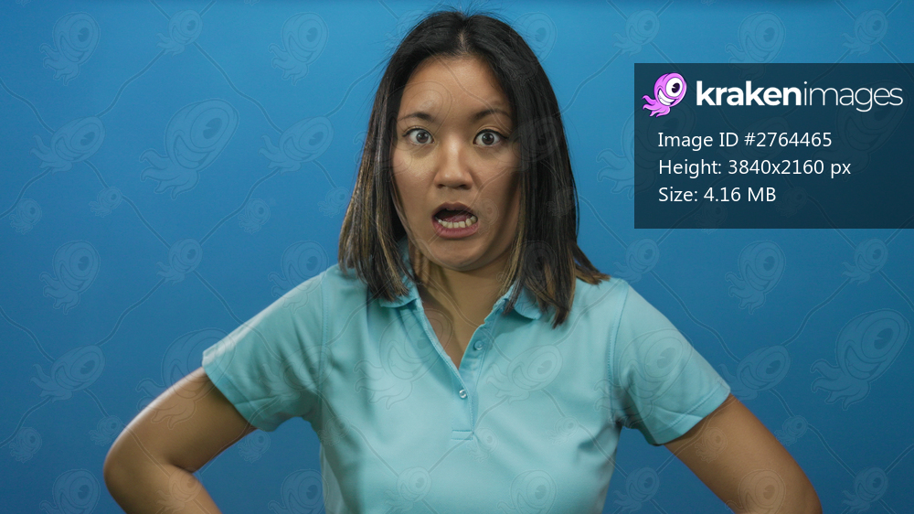 Woman expressing surprise over a blue isolated wall backdrop, wearing a light blue shirt, showcasing various facial emotions, conveying young adult chinese female in shock. - Kraken Images
