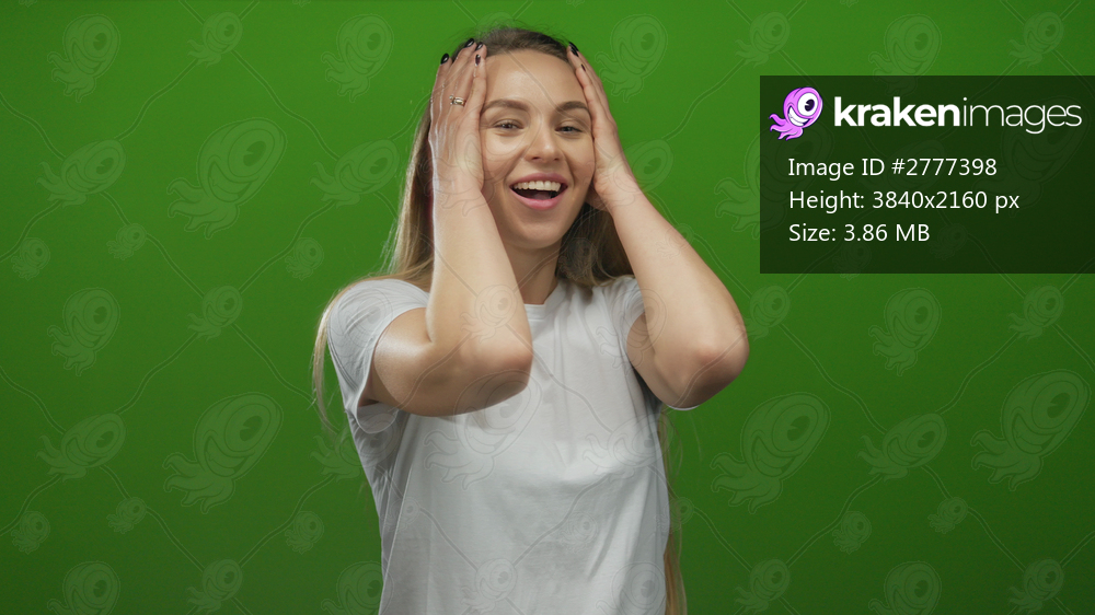 Woman expressing surprise over green background wall with eyes closed and hands on cheeks wearing white shirt showing youthful enthusiasm in an isolated setting. - Kraken Images