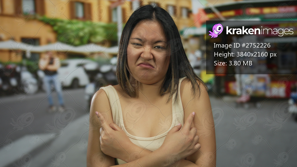 Woman expressing uncertainty with arms crossed standing on a busy city street, showcasing a diverse urban scene with shops and vehicles, capturing everyday life outdoors. - Kraken Images