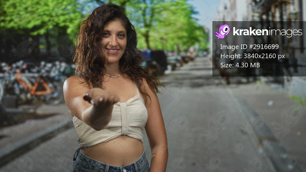 Woman extending palm forward and showing midriff on a sunny city street while smiling and holding out her hand; friendly welcome.