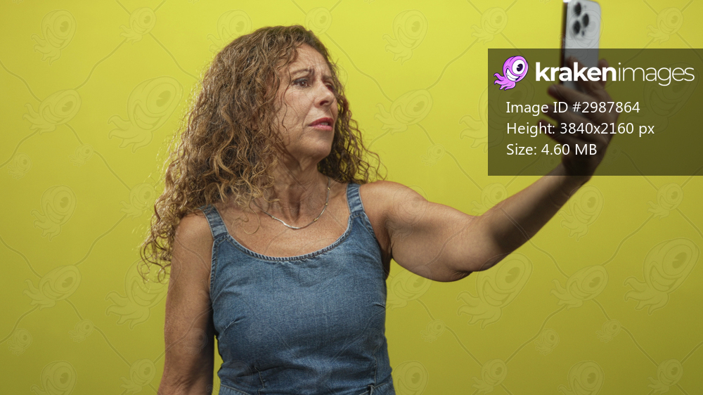 Woman extends arm holding smartphone for selfie in studio, squinting and checking her face against a yellow wall while wearing a denim sleeveless dress; concern. - Kraken Images