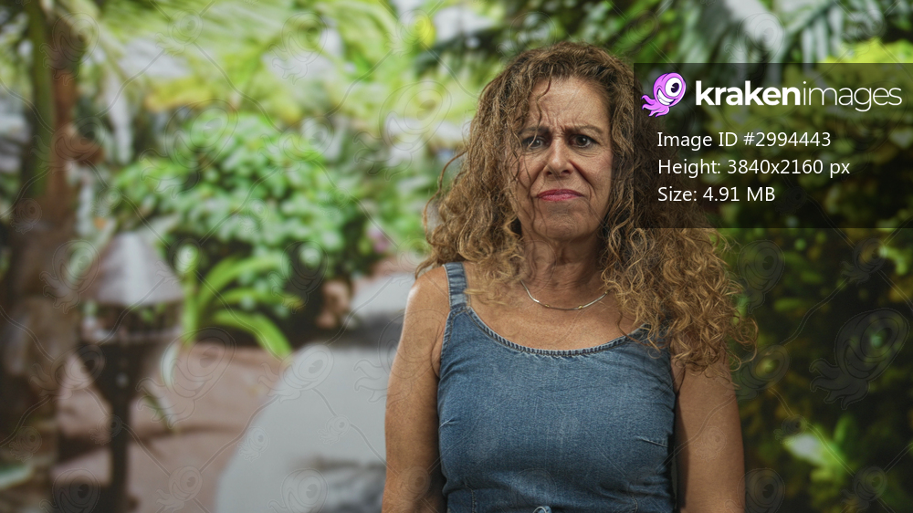 Woman extends arms in a shrug gesture wearing denim dress in a studio with tropical garden backdrop; confusion.