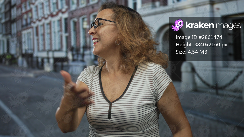 Woman extends bare forearms and open hands with broad smiling face on cobblestone street; joy warmth.